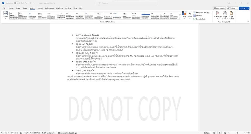 วิธีใส่ลายน้ำของเอกสารบน Microsoft Word เพียงแค่เปิดไฟล์เอกสารที่ต้องการ จากนั้น คลิกปุ่ม Design จากนั้นคลิก Watermark ภายใต้หัวข้อ Page Background จากนั้นก็คลิกเลือกรูปแบบได้เลย แต่ถ้าต้องการเปลี่ยนข้อความเป็นของเราเอง ก็สามารถทำได้เช่น่กัน